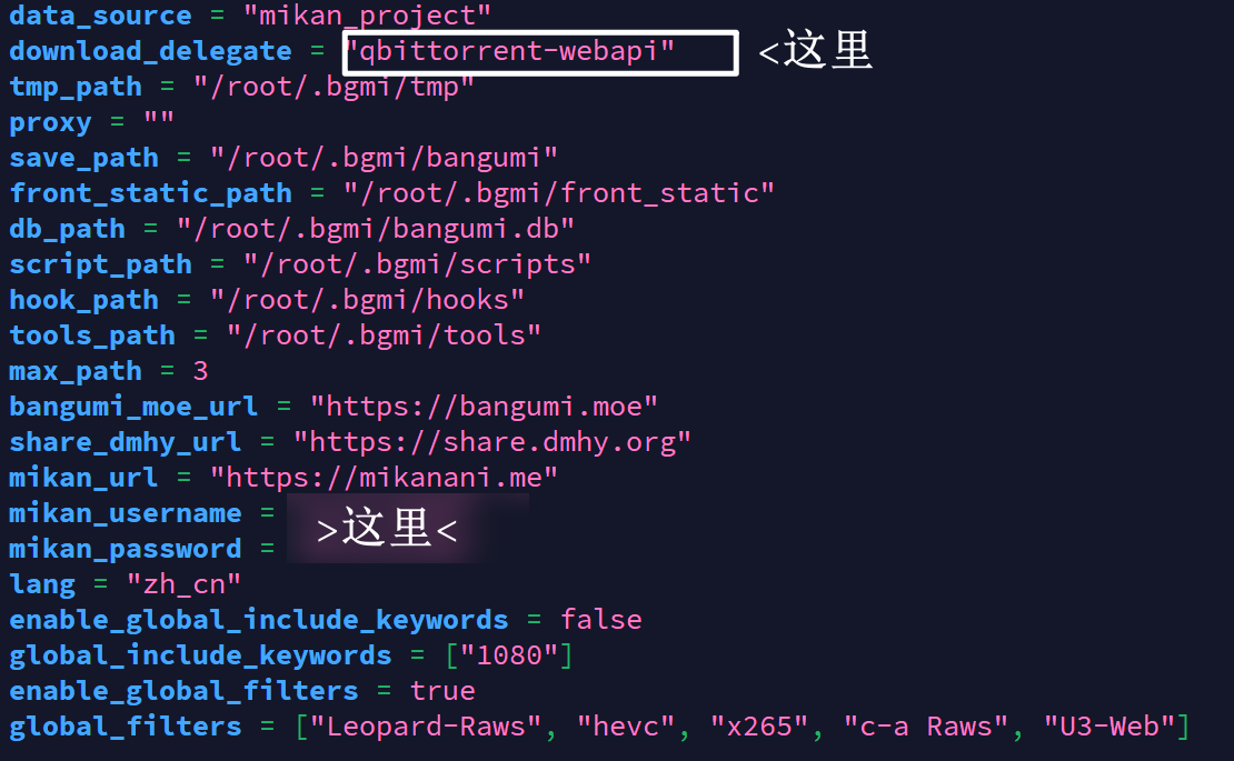 进入编辑器。在英文键盘下按下i键进入编辑模式,修改mikan_username和mikan_password。夜梦建议在一步同时修改download_delegate为qbittorrent-webapi,具体修改如下图所示: