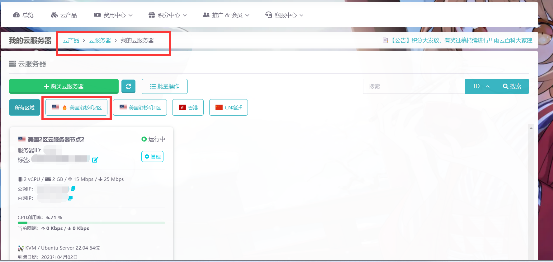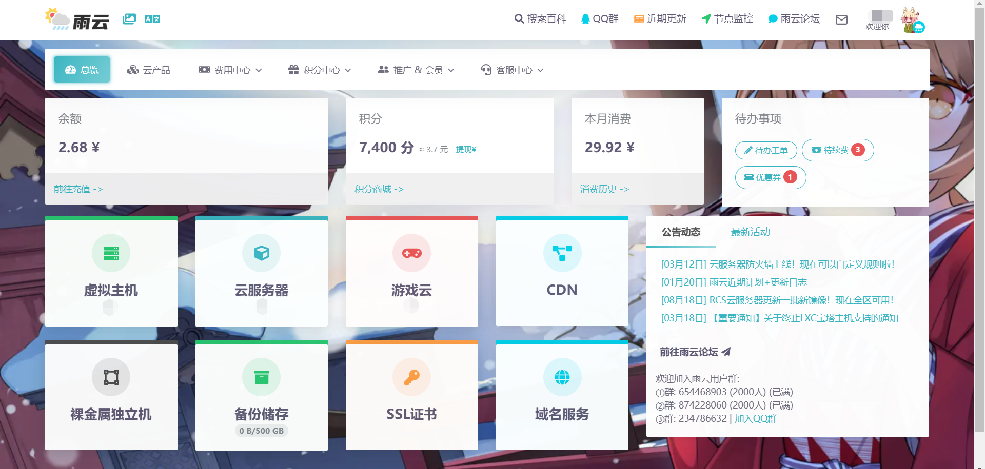 购买完服务器之后,你可以在后台面板中看到自己服务器的配置信息。你也可以在后台面板中进行添加防火墙,扩容云盘,升级配置,续费等操作。这里夜梦不再多做叙述,感兴趣的小伙伴可以通过雨云论坛自行研究,也可以通过官方售后群进行询问。