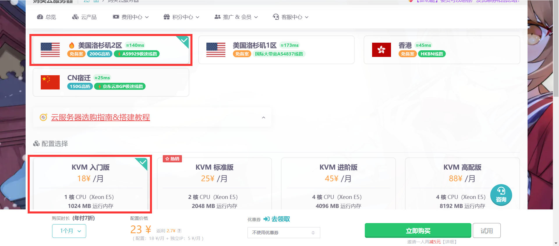 这里购买美国洛杉矶2区的1C1G服务器即可。1C1G服务器在前期已经足够使用。