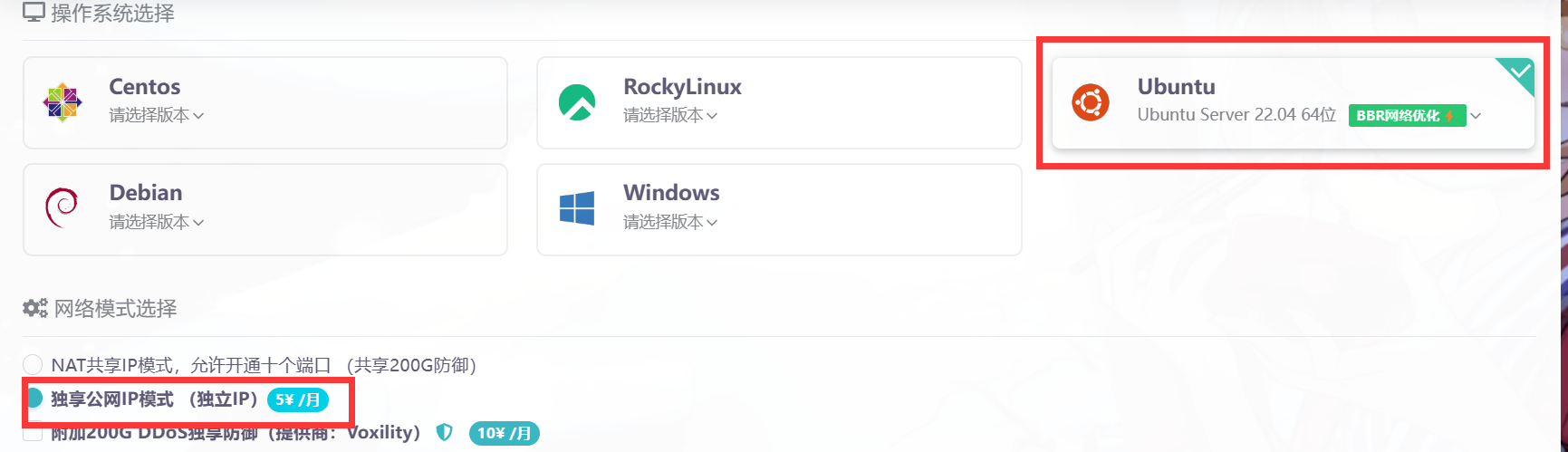 这里的系统选择Ubuntu22.04版本,并且附加独立IP: