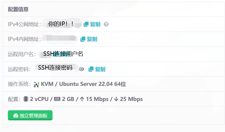 点进去之后,就可以查看自己的服务器配置信息(夜梦这里使用先前购买的2C2G服务器进行演示,和1C1G并无多大差别):