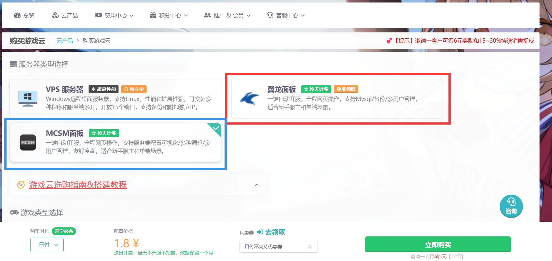 这里提供了翼龙面板和MCSM面板两种面板,小伙伴可以根据自己的喜好进行选择哦!夜梦这里选择的是翼龙面板~