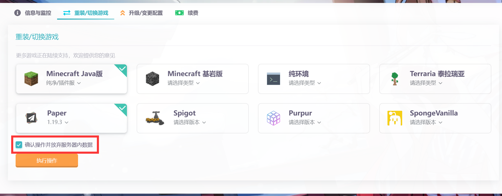 然后就可以自己选择版本啦!记得勾选确认操作并放弃服务器内数据哦!