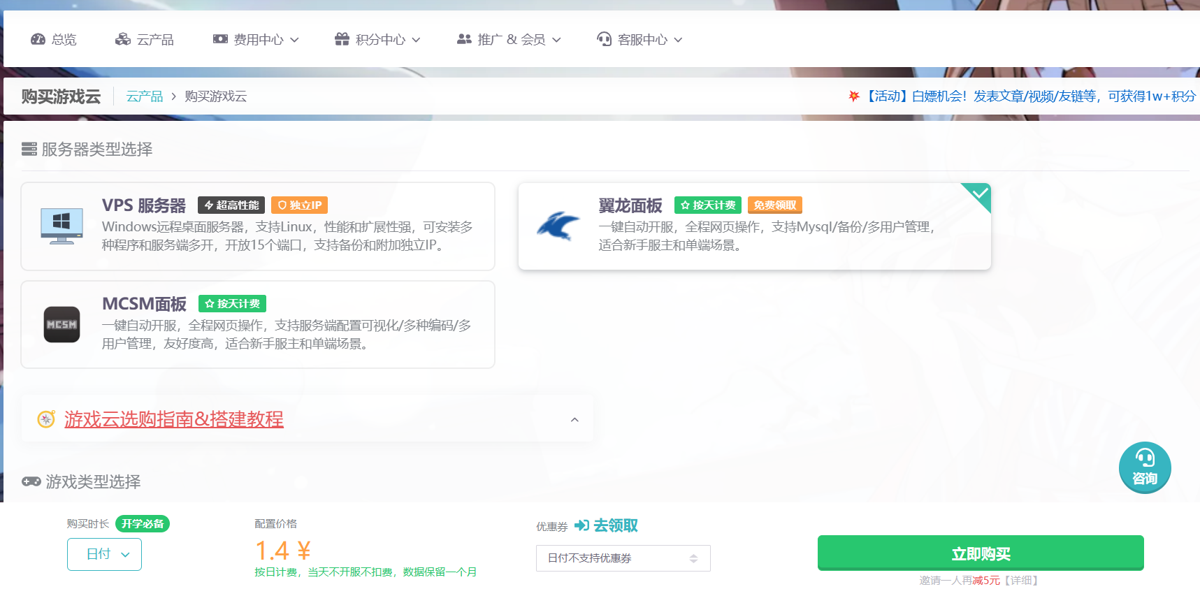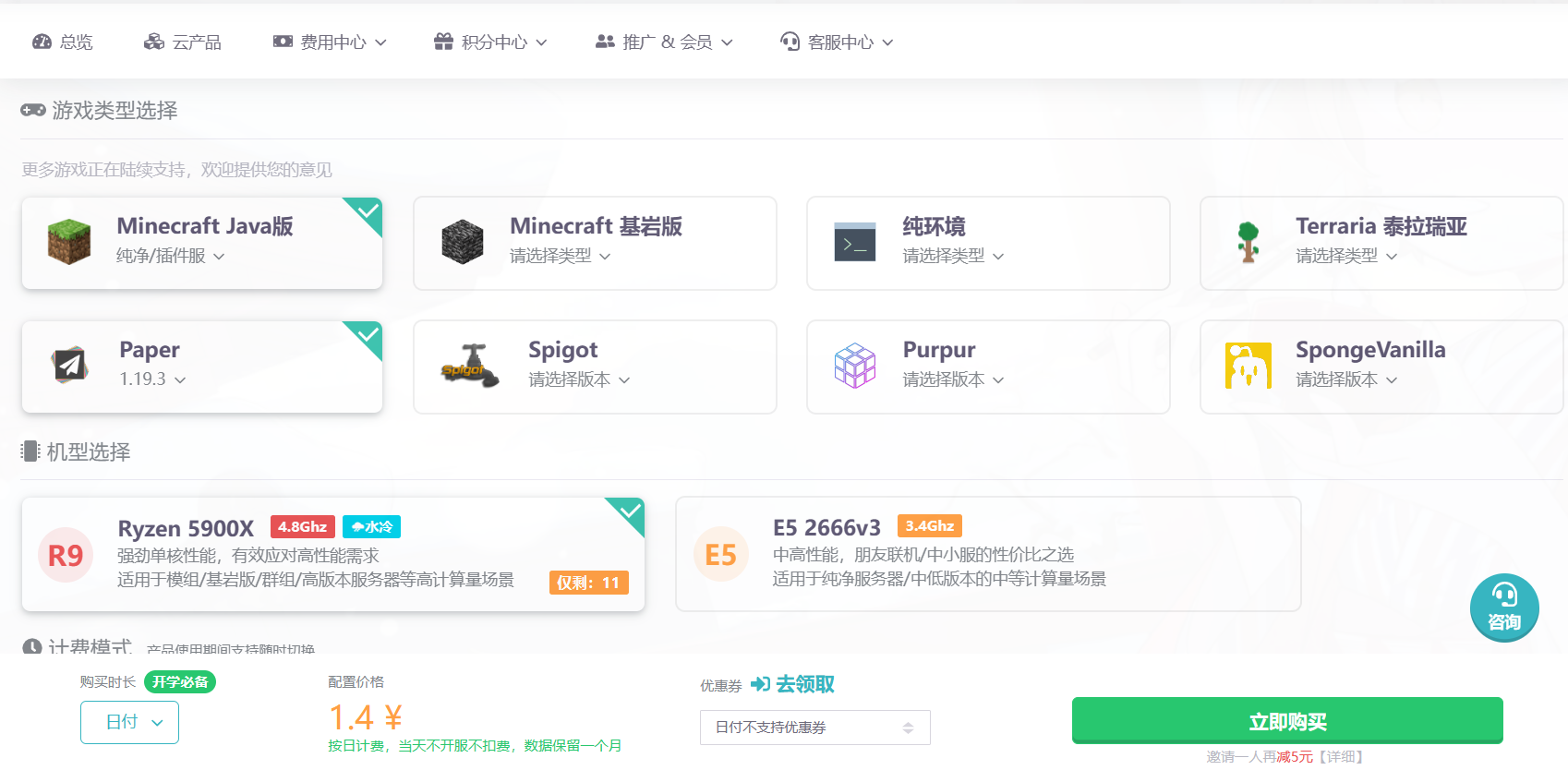 但是,大家都知道(可以搜索),一般的云服务器都很昂贵。小伙伴们可以自己去腾讯云阿里云这种顶级大厂首页看看,虽然新人购买服务器有优惠,但是优惠的服务器不能满足开MC的需要。如果要满足需求的话,再怎么新人都得上千元。这显然很矛盾啊= =