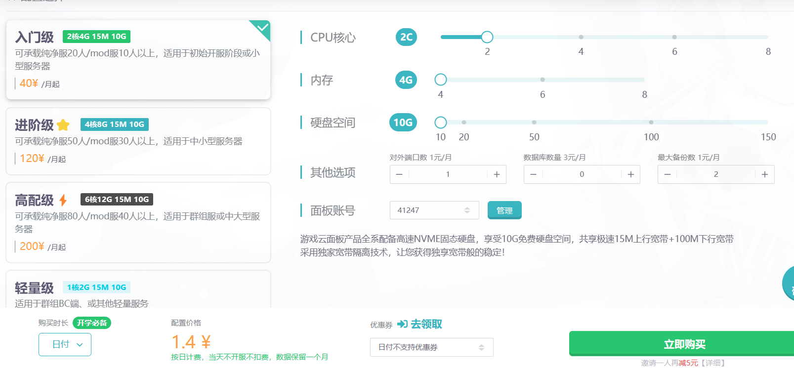 • 面板服支持日付,最低每日仅需要一包辣条的价格。并且提供备份,不想玩的时候只要将地图数据备份到本地,然后删除服务器即可停止计费,周末有空的时候可以上传自己的地图再次开服
