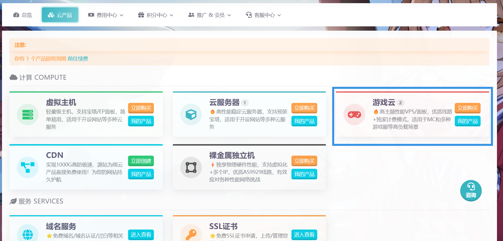 • 雨云游戏云提供VPS面板服两种选择。VPS具有高性能并且拓展性极强;面板服则简单易上手,不超开保证质量。