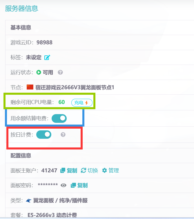 • 夜梦用蓝框框出来的就是用余额结算电费,如果你开启的话,当你的CPU电量没有以后,雨云会使用你的余额等价抵扣超量CPU产生的费用。如果你担心熊孩子捣乱的话,可以关闭哦~后期如果缺电量的话,可以使用积分兑换CPU电量,也十分方便!