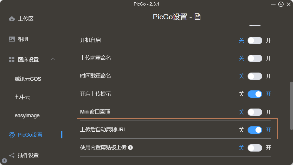 如果需要上传图片的时候自动复制链接,那么可以在设置中开启选项: