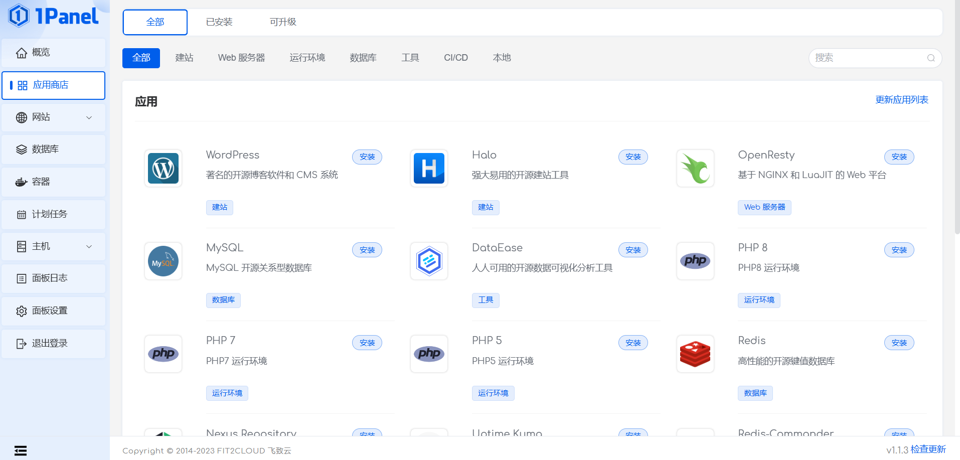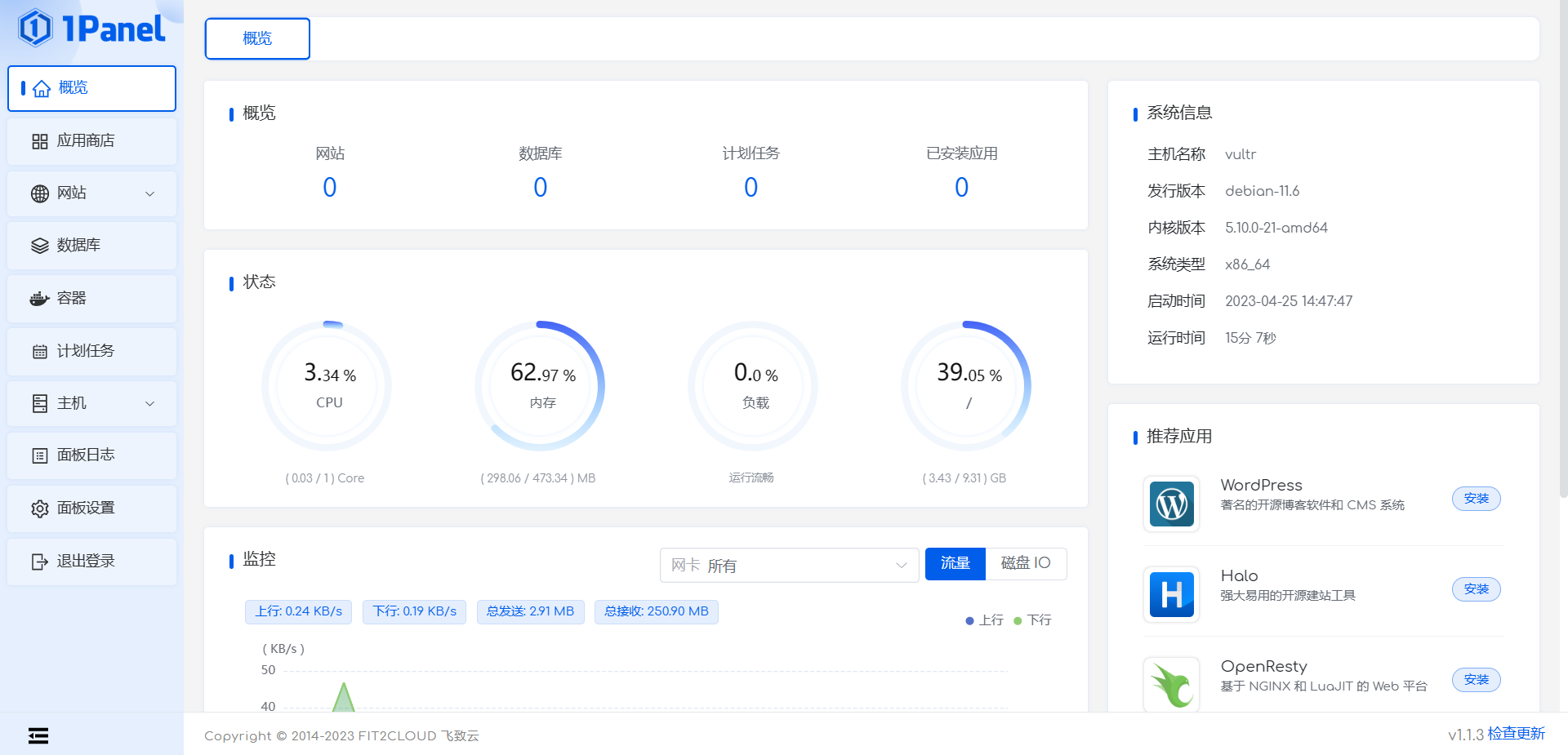 这两天夜梦碰巧看到了一个新的面板1panel,于是就部署了一下,个人感觉总体比宝塔简洁美观一点。而且不用绑定账号什么的,比较自由。但是作为新兴的面板,在一些环境配置的方面相比宝塔还是略有欠缺,比如最基本的PHP版本有限,不像宝塔提供众多版本。但是还是能够满足基本需求的。