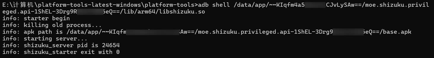 adb shell /data/app/~~KIqfm4xxxxxxxxxJvLySAw==/moe.shizuku.privileged.api-1ShEL-3DrgxxxxxxxeQ==/lib/arm64/libshizuku.so