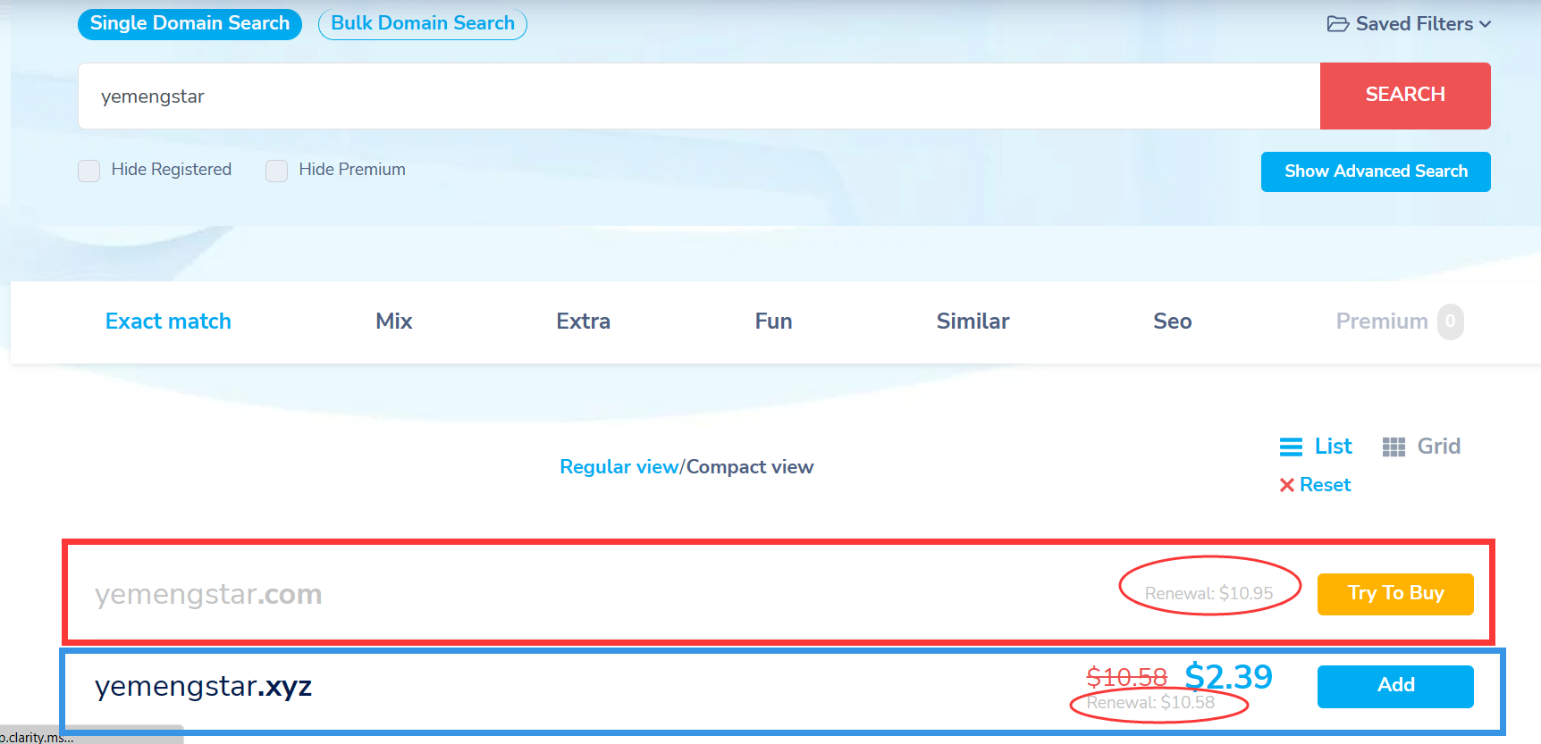 yemengstar.com的域名,但是这里是灰色的(红框),说明域名已经被注册了。 - 但是下面yemengstar.xyz是黑色的(蓝框),说明未被注册。