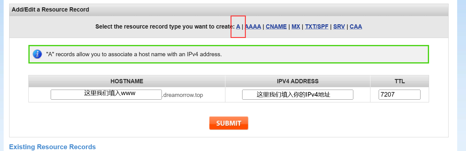 我们添加一个主机名为www的A记录指向之前购买的服务器的IPv4地址: