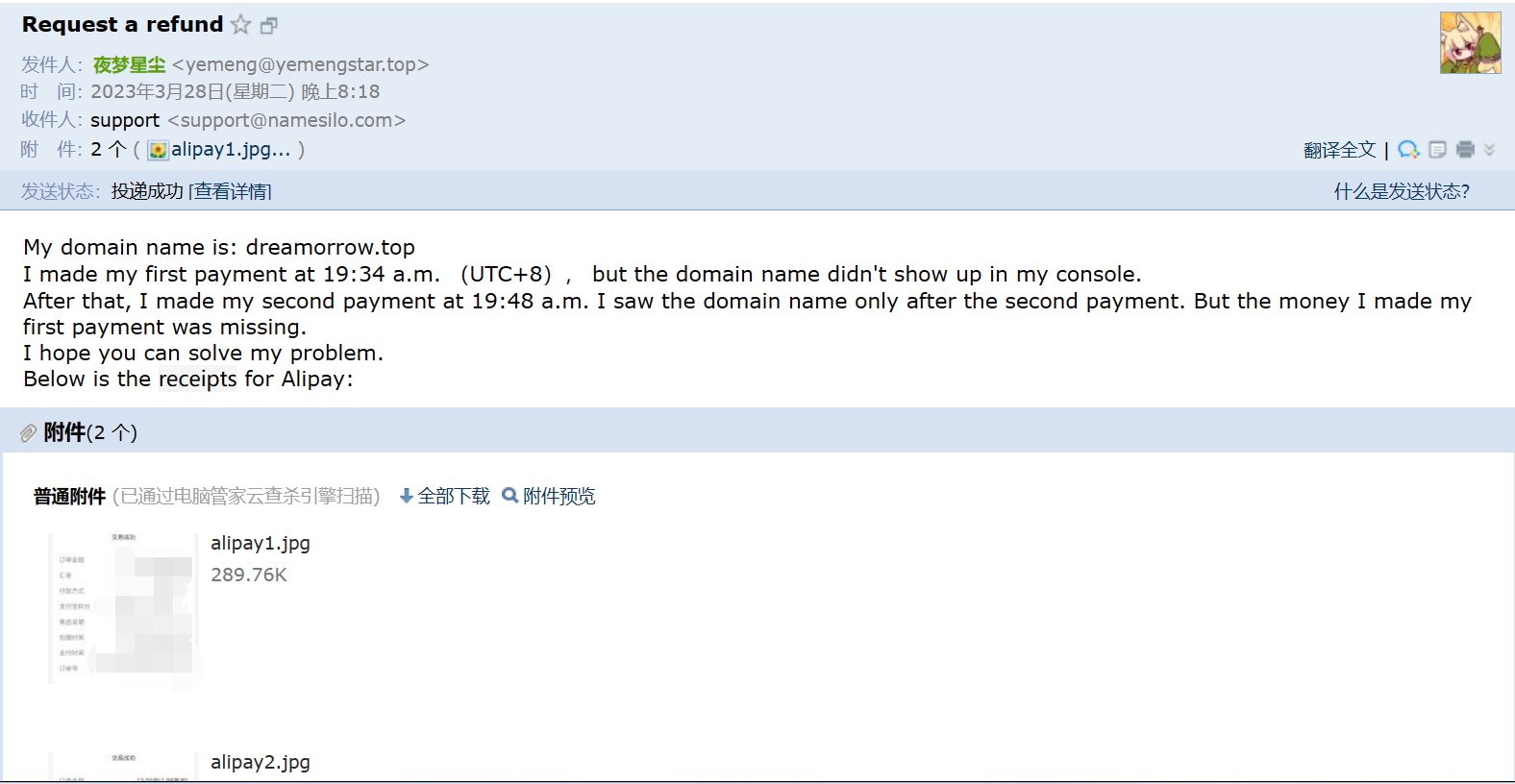 其实在写这篇教程的过程中出了一点小问题,我第一次支付完毕之后因为不知名的原因未收到域名,直到我进行了第二次支付。