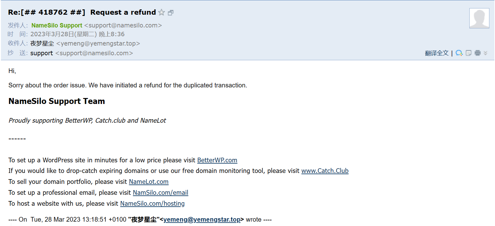 财务售后的处理速度还是可以的,正好我在写下一篇教程的时候他们就发来了已退款的邮件。