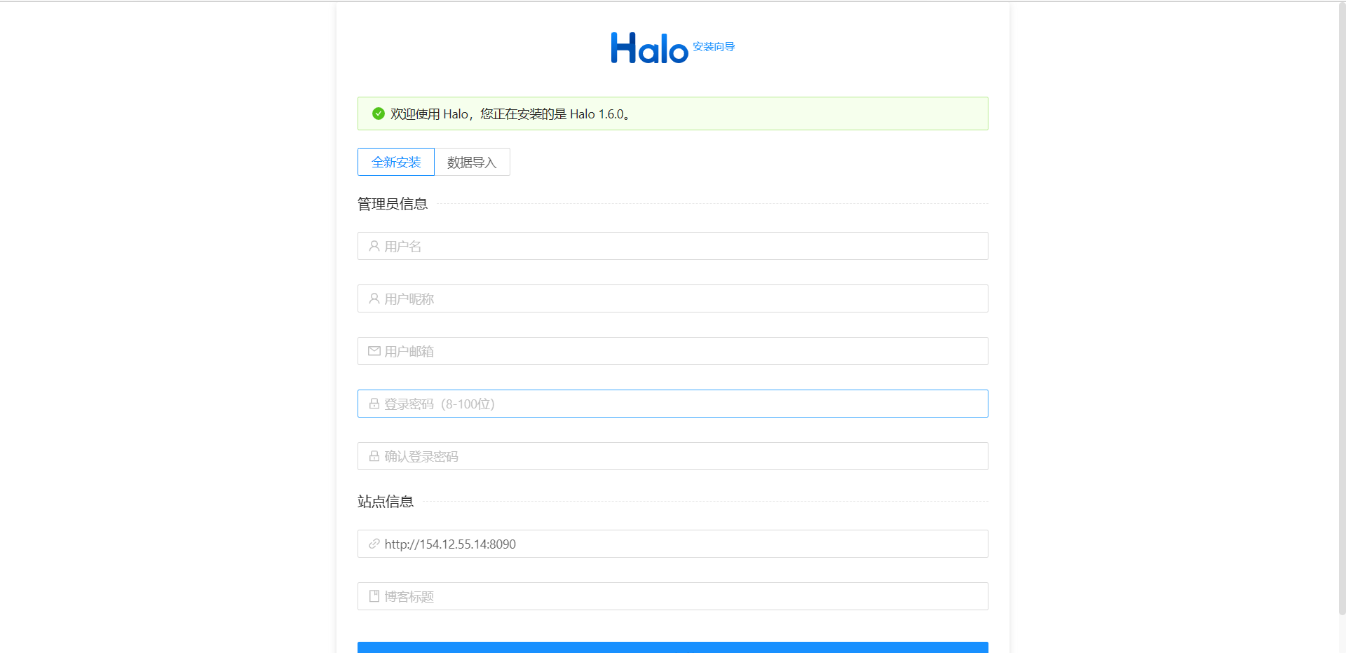 创建完毕容器之后,我们就可以通过http://ip:8090访问我们的halo博客了!