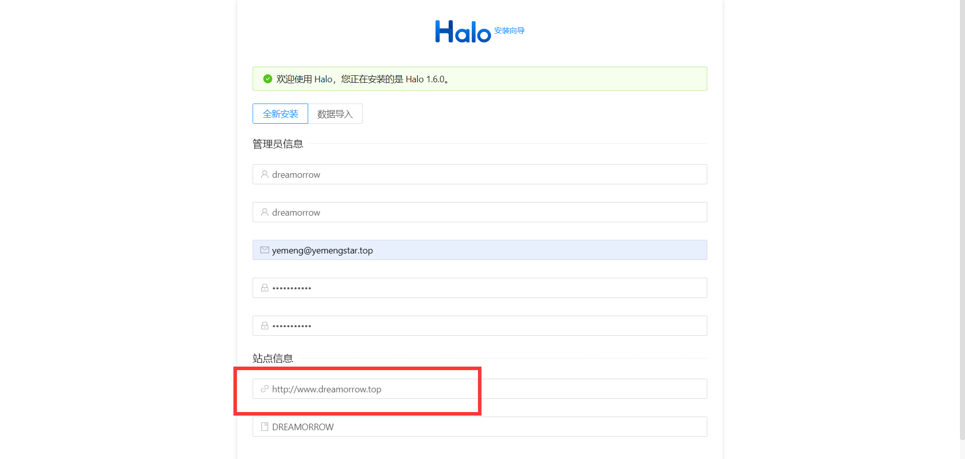 上面的用户名、用户昵称、用户邮箱、用户密码自己填就好了,就和普通的注册账号没什么两样。需要注意的是下面站点信息中夜梦用红框框出来的地方。这里我们填写先前解析到这个IP的域名!