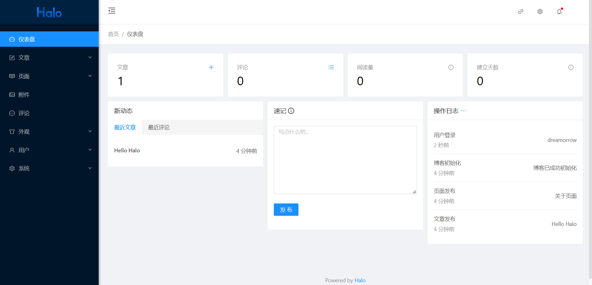 - 1.6.0版本的halo的后台简洁明了,易于上手操作。并且1.6版本的halo适配的主题很多,大家可以自行前往主题仓库 | Halo 建站 – 强大易用的开源建站工具进行挑选。
