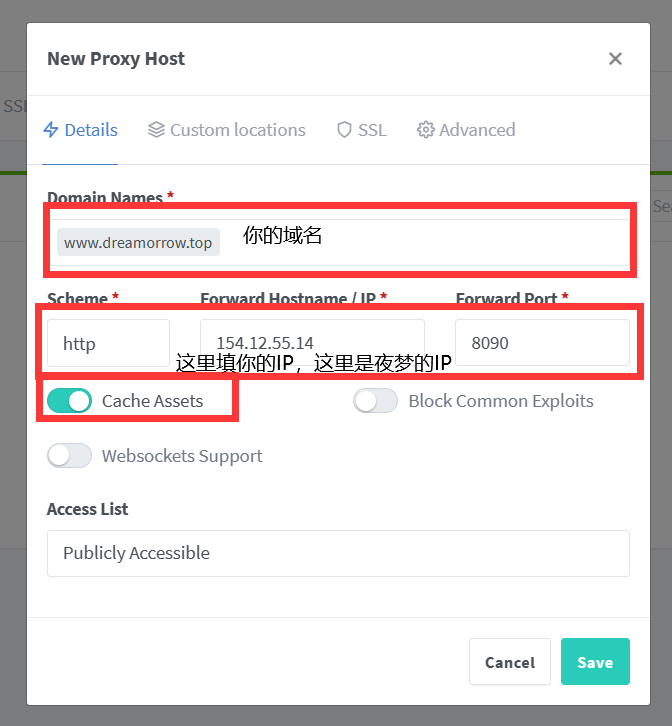 填写你自己的域名和服务器IP地址:
