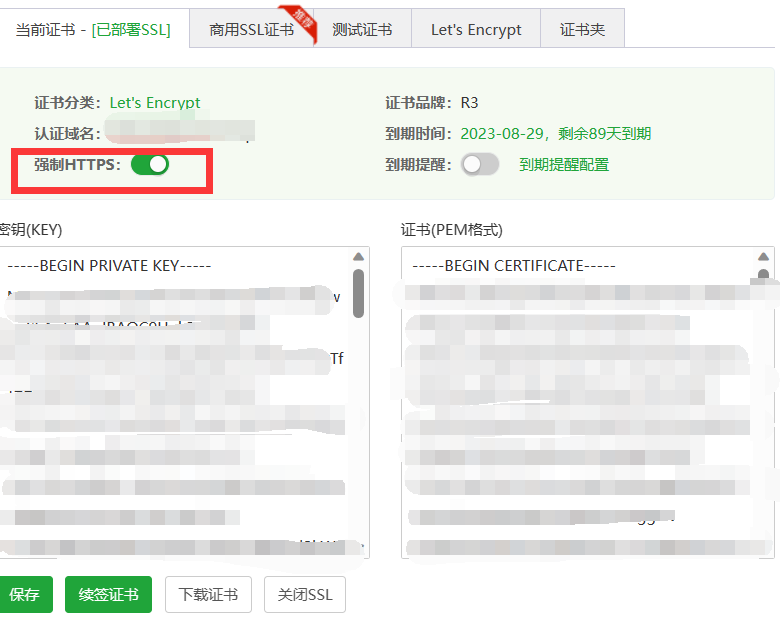 然后在当前证书下,勾中强制HTTPS,保存后退出即可!