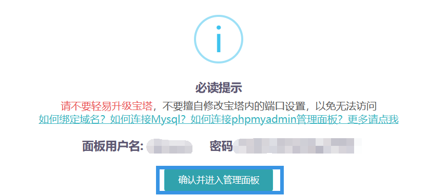 安装完成以后,根据控制台中输出的信息进入宝塔,完成基础设置。
