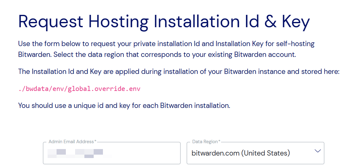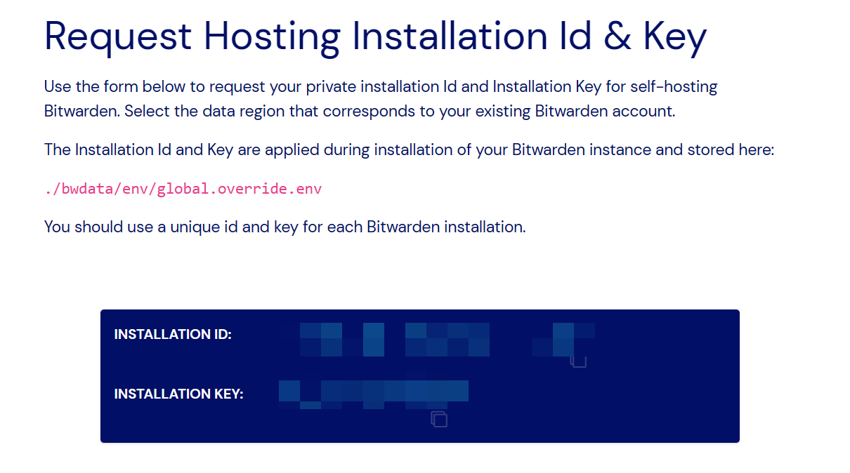 - Enter your installation id:到https://bitwarden.com/host取获得Id&Key。
