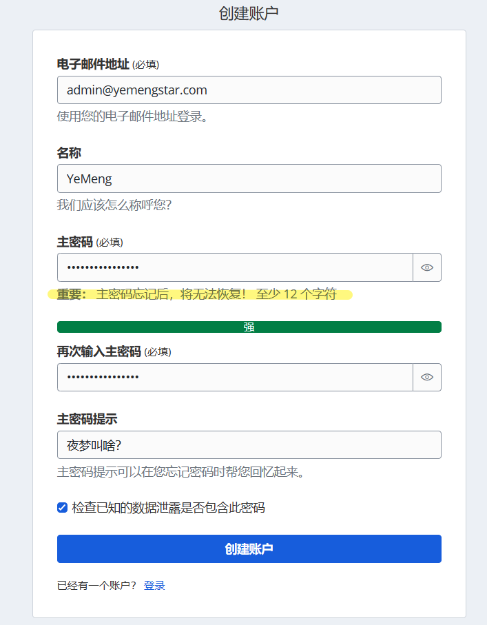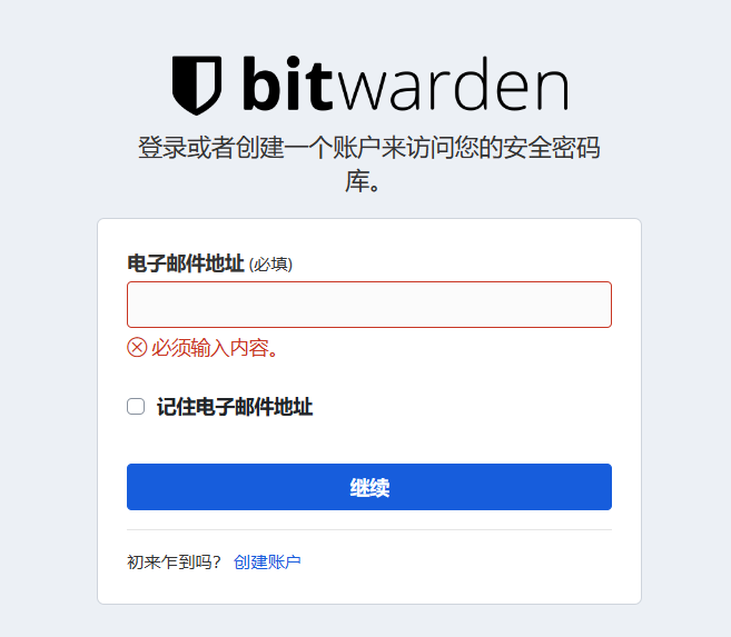 访问之后你需要注册一个新账户然后才能登录。你必须完善SMTP的相关配置!!!要不然你验证不了邮箱也就用不了Bitwarden了。