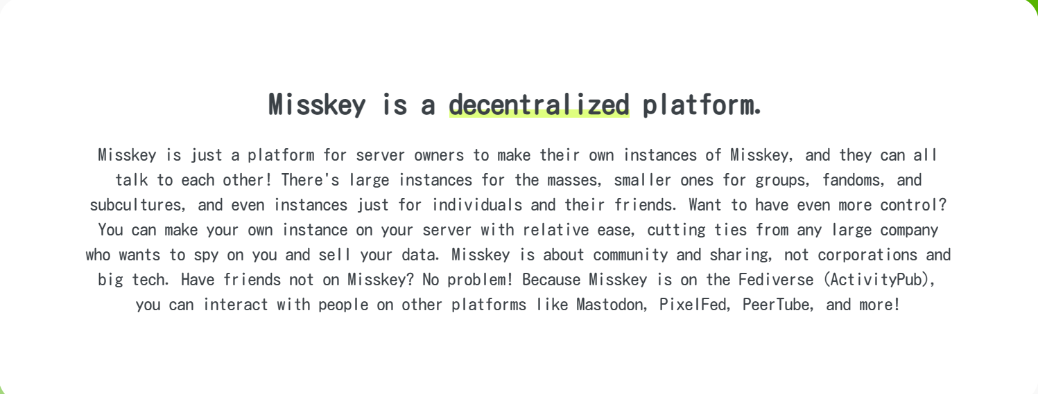 misskey是一个去中心化微博,你可以搭建自己的实例,也可以加入其他人的实例。经过这两年的发展,夜梦觉得它已经算是一个比较成熟的程序了~