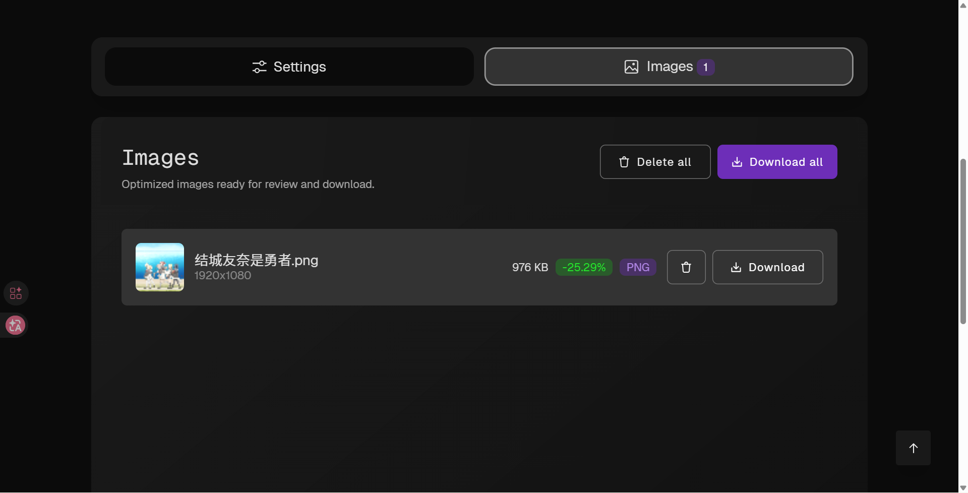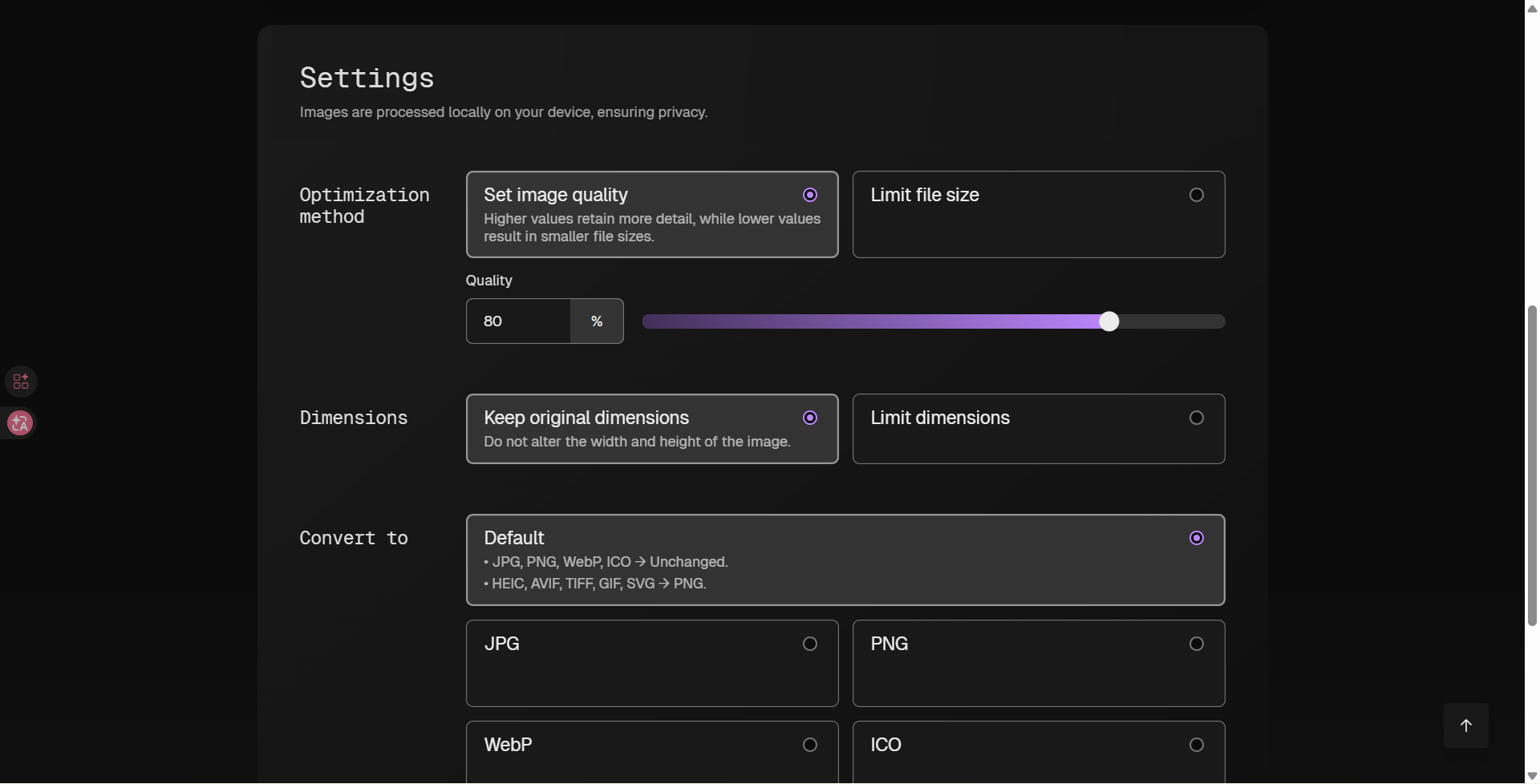 自部署的图像处理工具(适合简单处理,例如调整画质,调整图片大小,转化格式等)。A self-hosted local image optimizer that runs in your browser