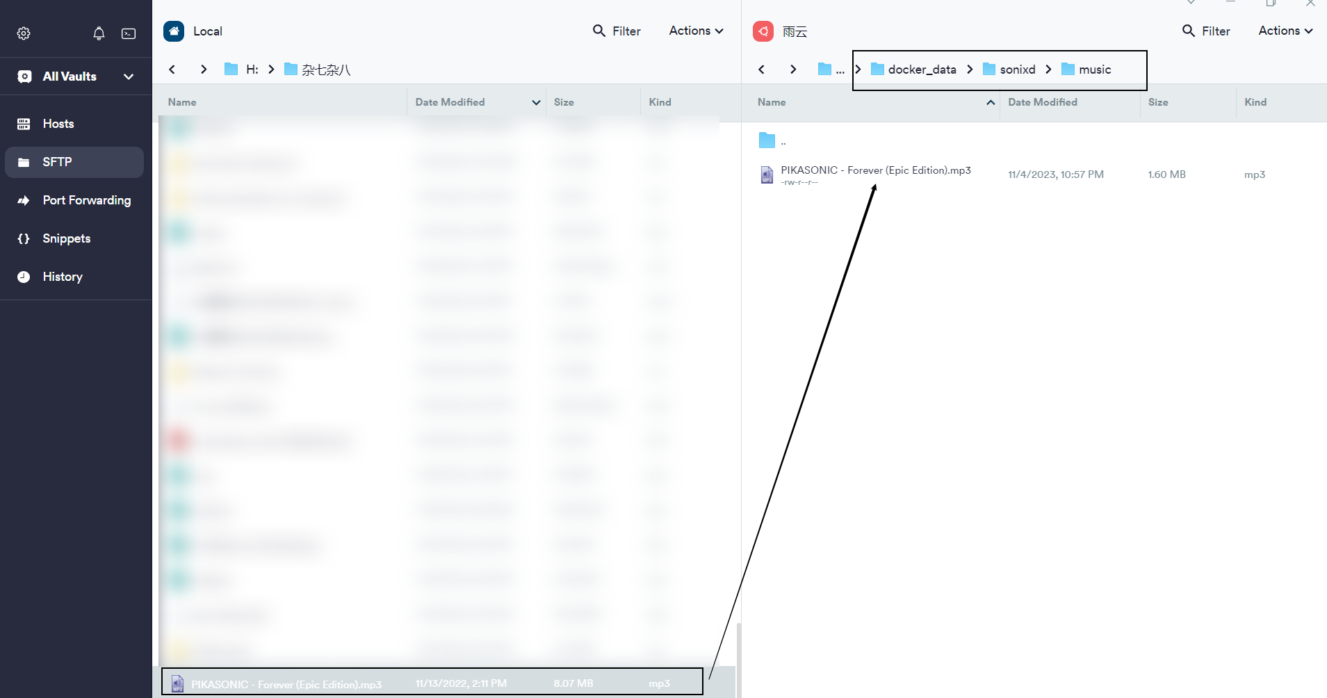 上传歌曲可以通过SFPT进行,夜梦这里使用termius客户端,你也可以使用免费的XFTP。