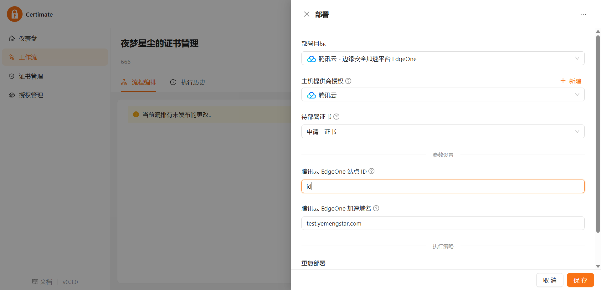 部署节点就是将你的证书部署到对应的地方,省去了你自己部署证书的操作(类似于腾讯云的SSL证书托管)。比如夜梦使用的是腾讯云的EO,那就可以这样配置: