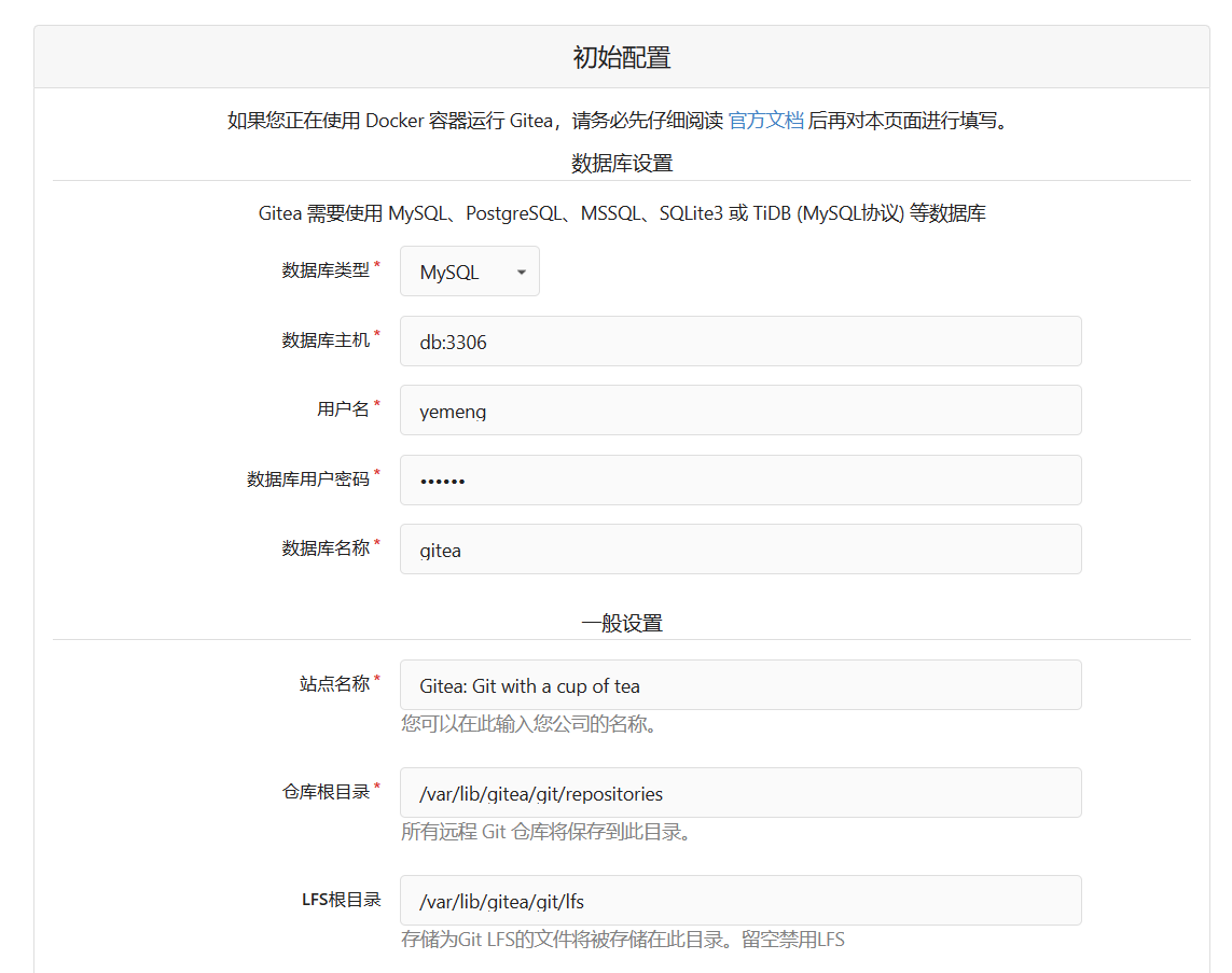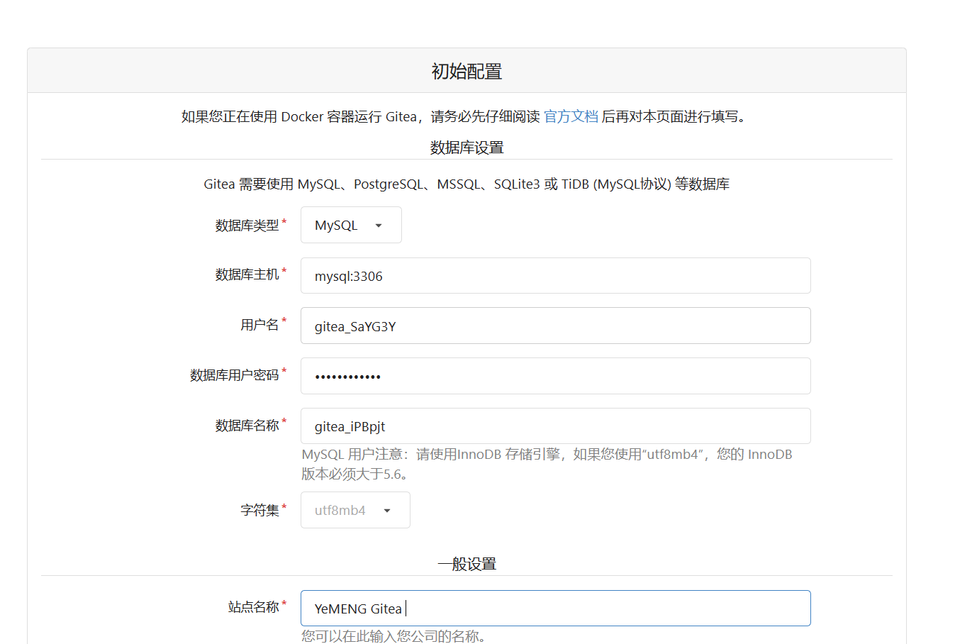 夜梦这里选择将 Gitea 与 MySQL 数据库结合使用,具体的配置文件如下