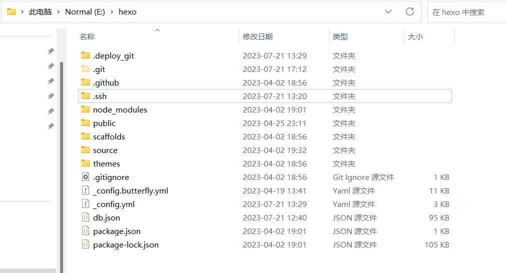 夜梦这里以HEXO仓库进行演示,仓库建立完毕以后,文件夹内容如下: