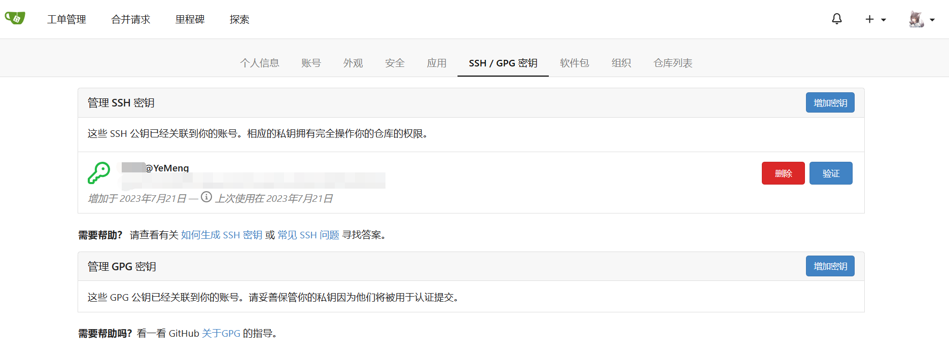 在设置–SSH/GPG密钥–管理SSH密钥,上传已经生成的公钥(.pub后缀),即可避免使用密码连接。