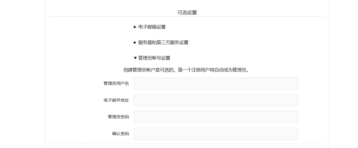 你可以直接设置管理员,也可以到后面进行注册。第一个注册的用户自动会成为管理员。