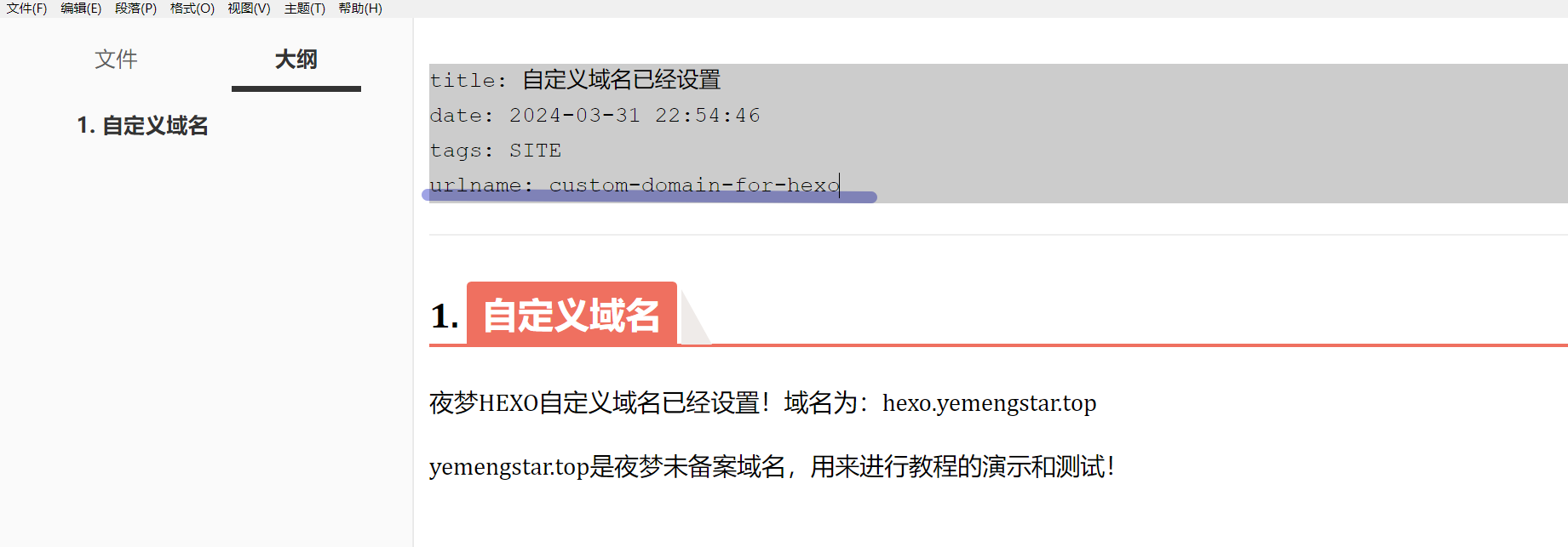 方便起见,夜梦这里只介绍最简单的方法,不需要安装插件,我们只需在写每篇markdown文章的时候,在Front-matter里加上urlname,例如: