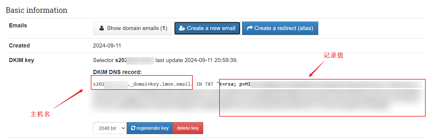 s66666666._domainkey.imoe.email.(具体看5.3节创建DKIM密钥) | TXT | v=DKIM1; k=rsa; p=MI... | DKIM 公钥记录,确保邮件真实性 |
