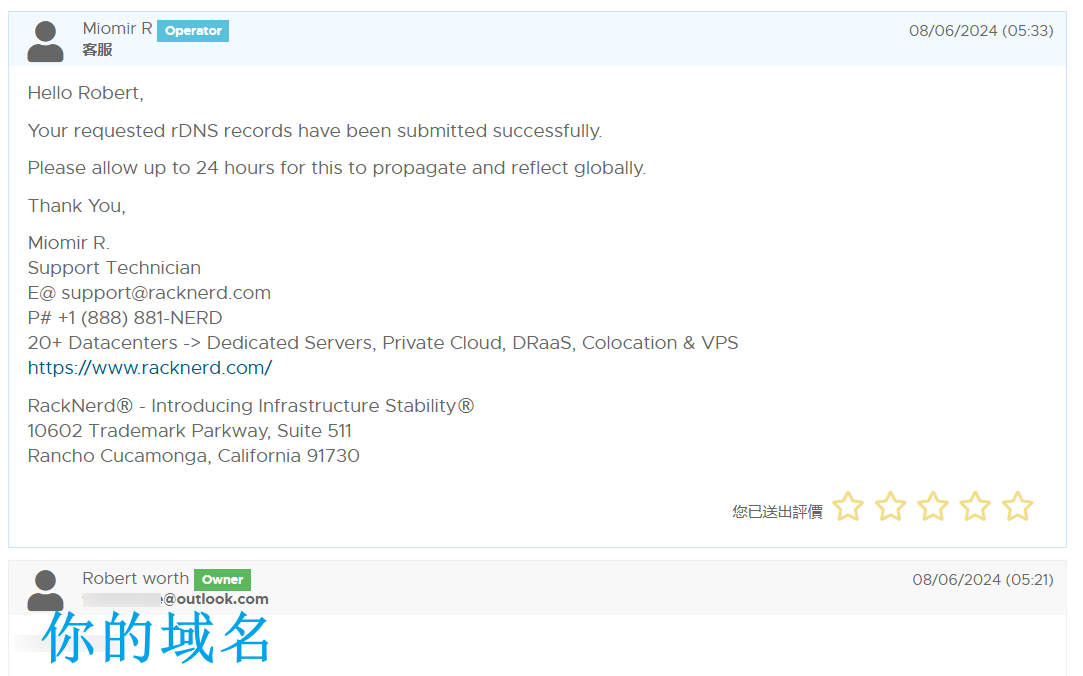 根据客服的回复,配置rDNS只能通过发工单让客服进行设置,其实也很简单,只要把你想要配置的域名发给客服,他就会帮你设置好rDNS。切记,rDNS只能设置一个域名!