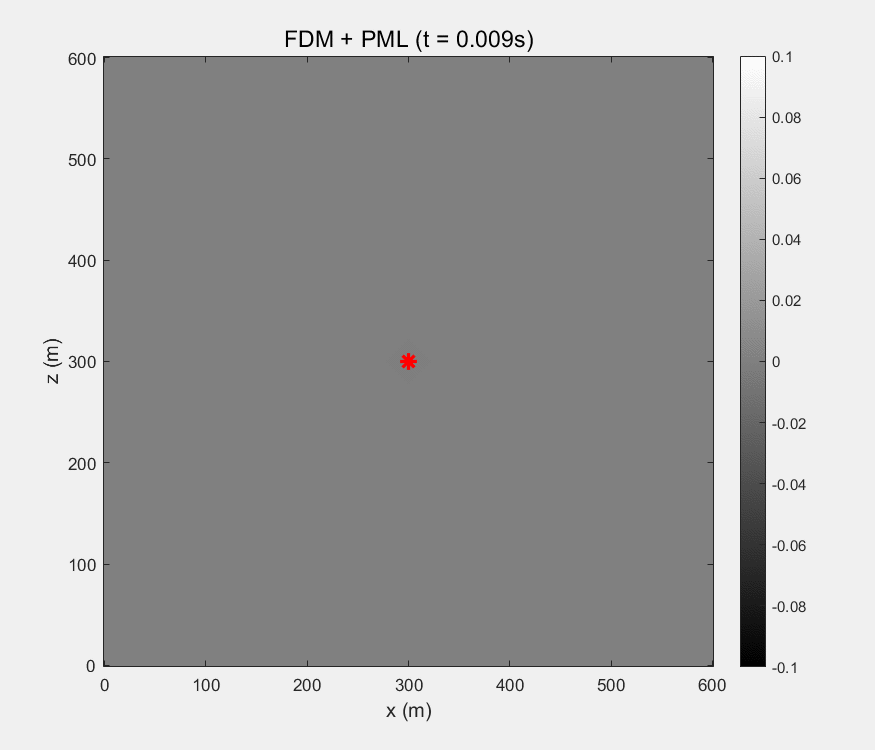 title(sprintf('FDM + PML (t = %.3fs)', t(it)), 'FontSize', 14);