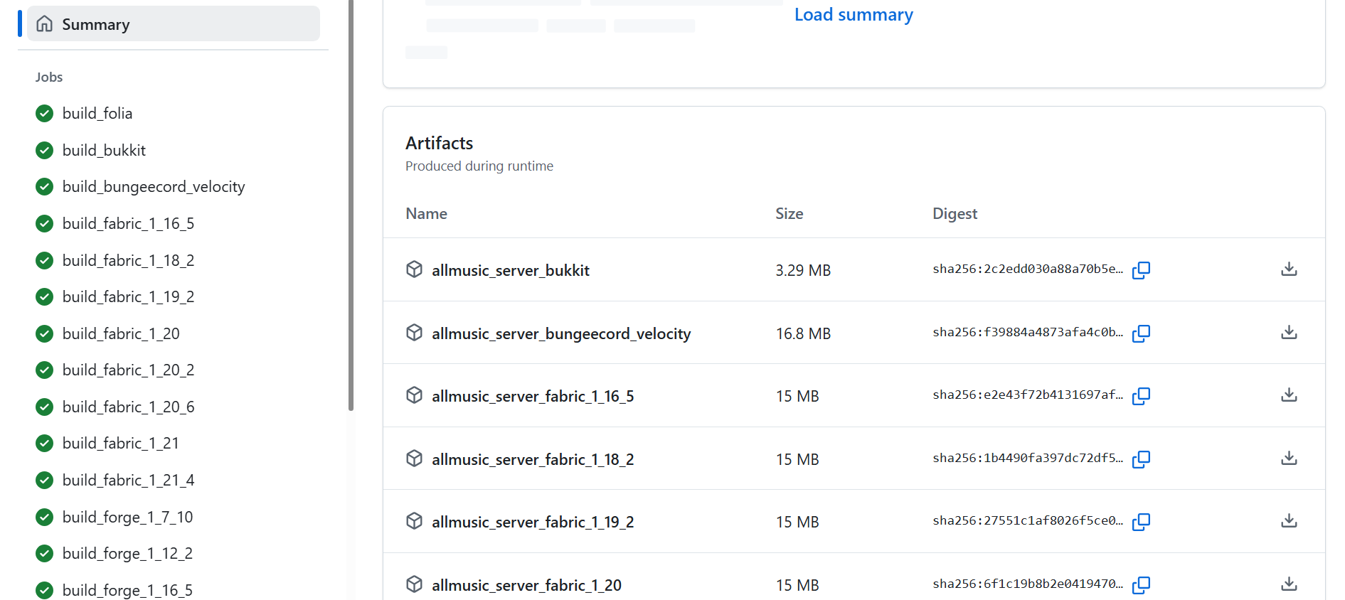 直接拉到页面最底部的artifacts。找到适合自己服务器端的插件下载,夜梦使用的是paper端,兼容Bukkit插件,所以下载第一个allmusic_server_bukkit