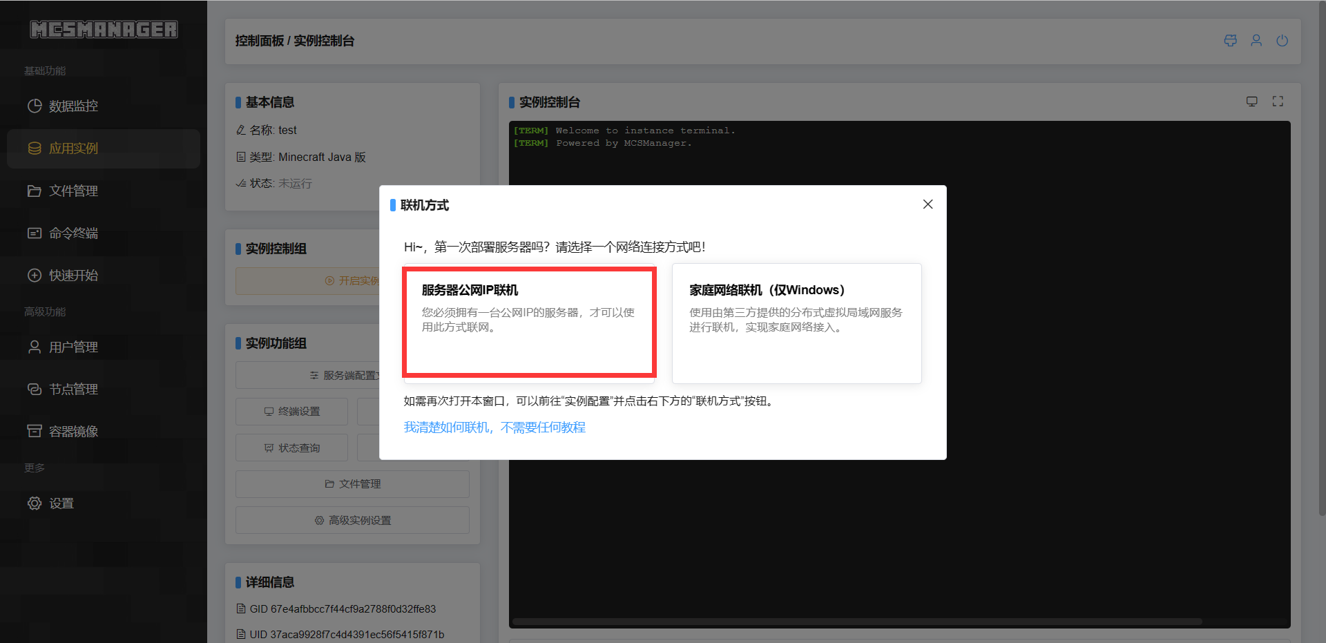 执行完成后,使用 systemctl start mcsm-{daemon,web} 即可启动面板服务。