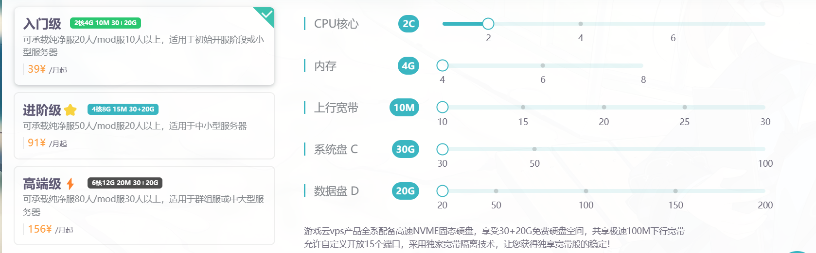 这里夜梦准备的是雨云游戏云VPS,可以选择的配置如下: