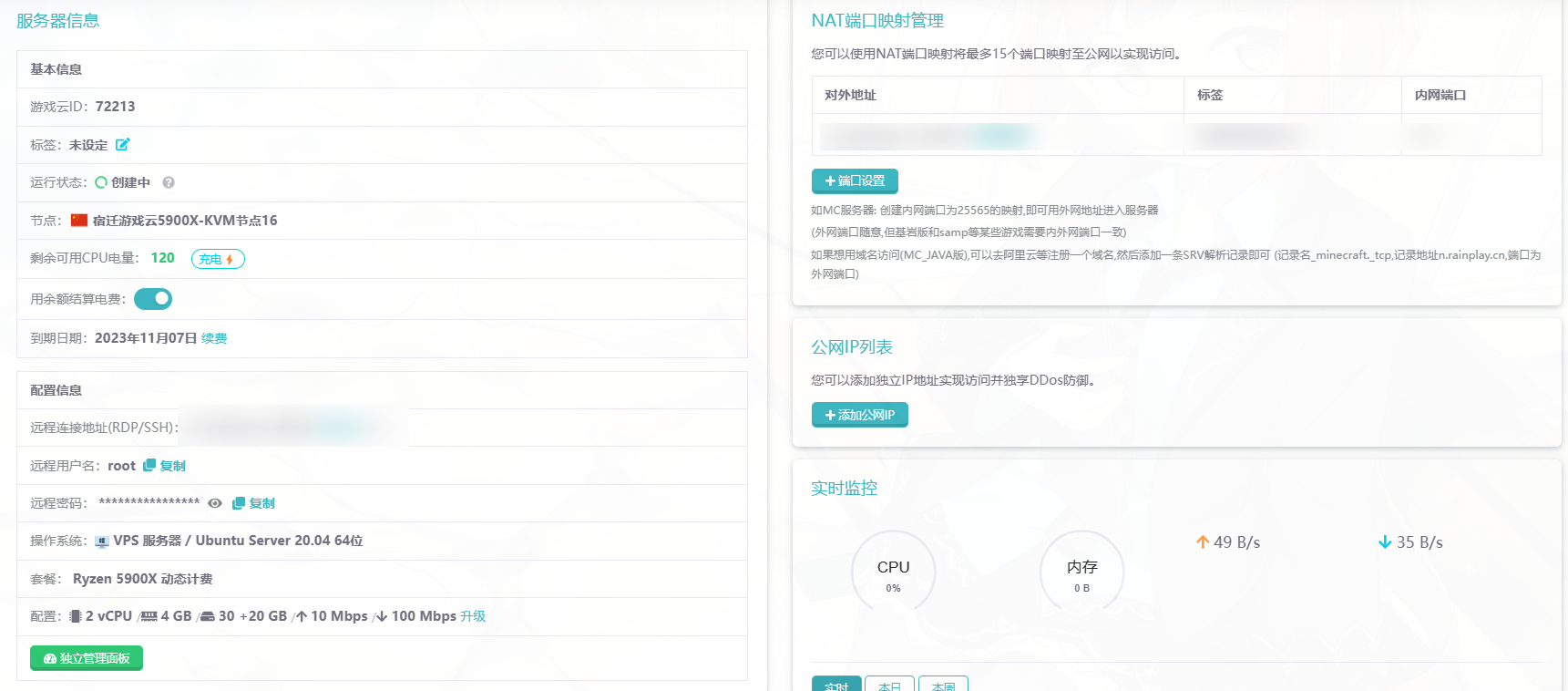 夜梦这里以R9-5900X进行演示,具体配置为2核CPU,4GB内存,动态计费(玩的人不多的话更加经济)。