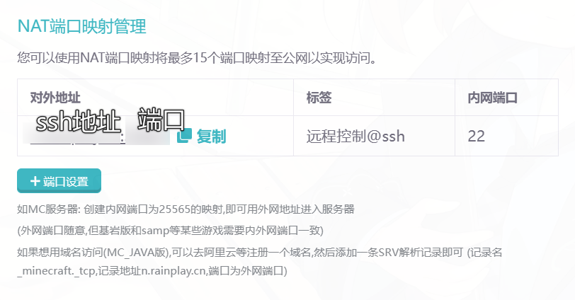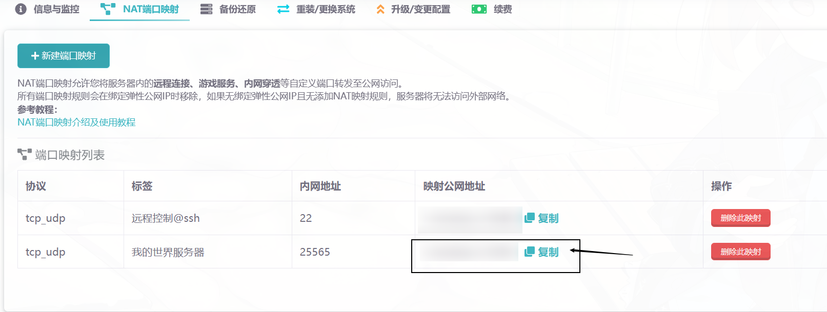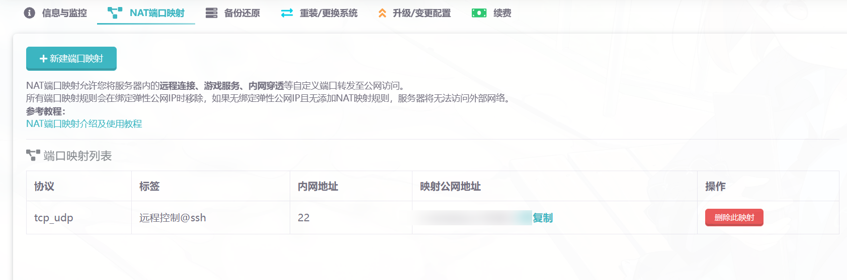 由于我们购买的是NAT服务器所以需要我们进行端口映射。我们进入NAT端口映射
