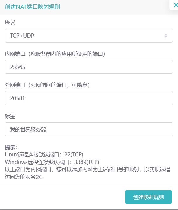 点击新建端口映射,将内网25565端口映射到外网(外网端口可以随意填写,未被占用即可)。