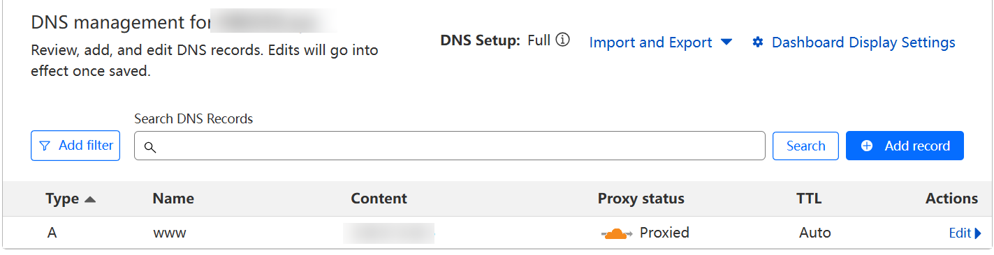 到Cloudflare上设置一下域名的解析,记得把小黄云打开!