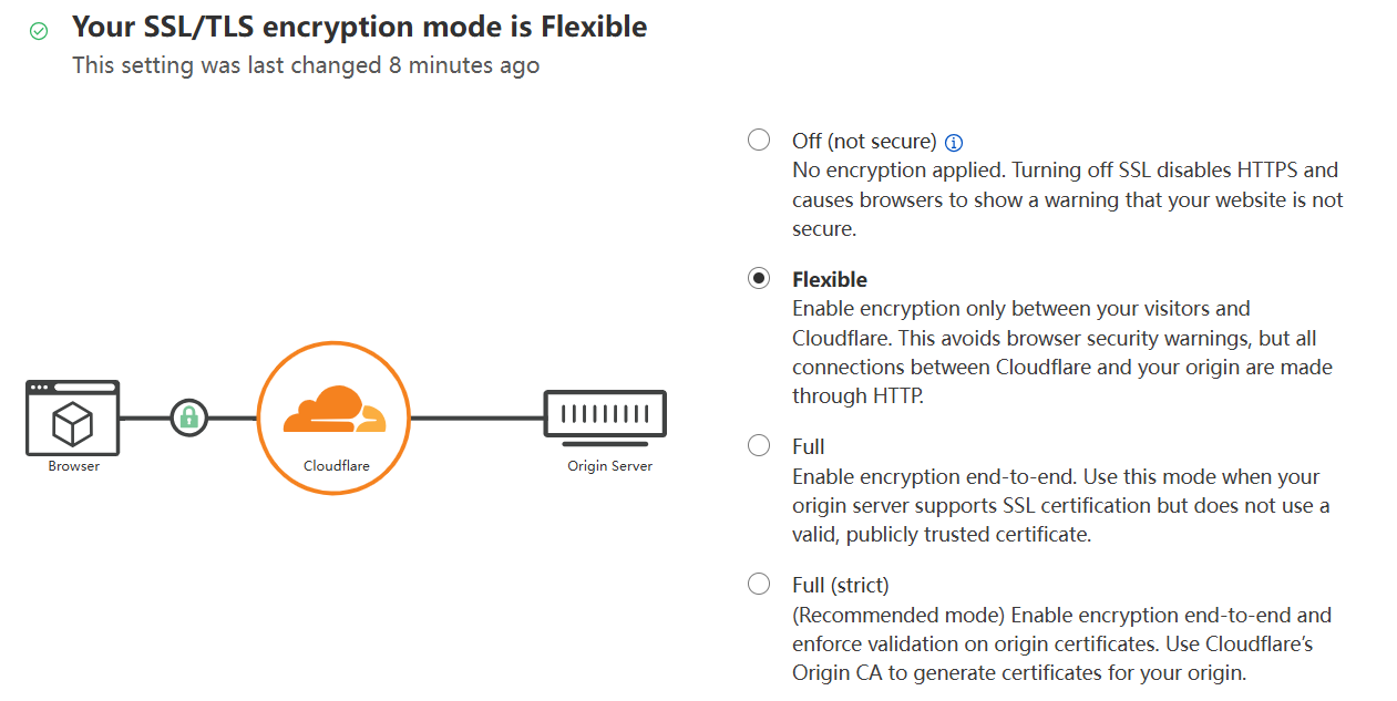 然后还没结束,还需要在SSL/TLS的概览中,将SSL/TLS加密模式调整为“Flexible”(一定要选择这个)。