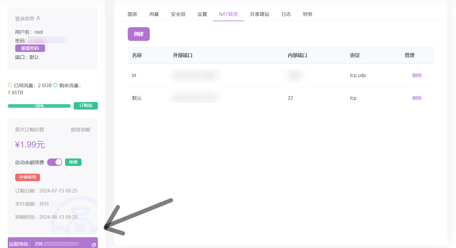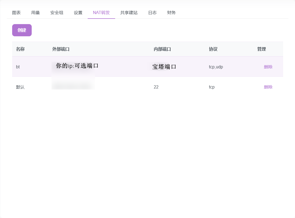 由于我们使用的是NAT机器,要访问宝塔必须配置端口转发。具体设置可以在机器的面板中查看: