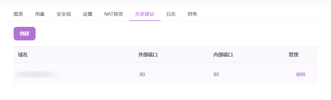 这时候我们回到NAT机面板那里配置共享建站,配置方式很简单。只要内外都选80端口,域名填写你解析的域名即可。