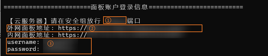 ①就是我们宝塔的端口,②是我们访问宝塔面板的地址,③是我们登录宝塔面板的用户名和密码。