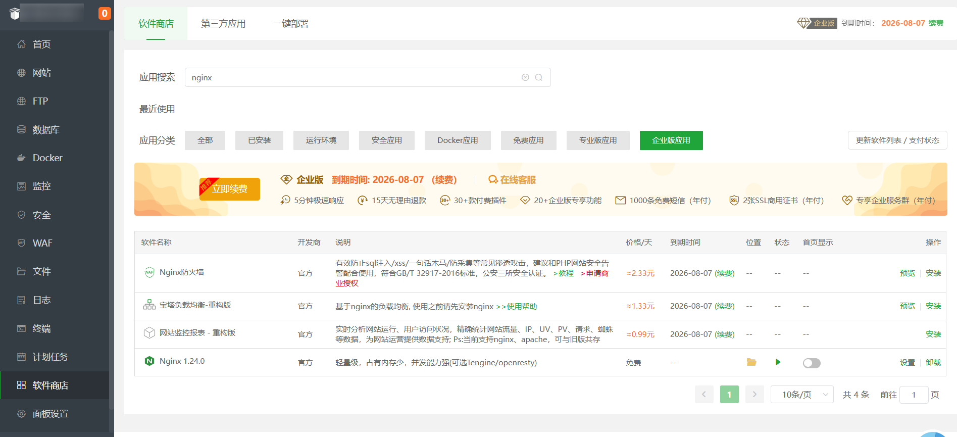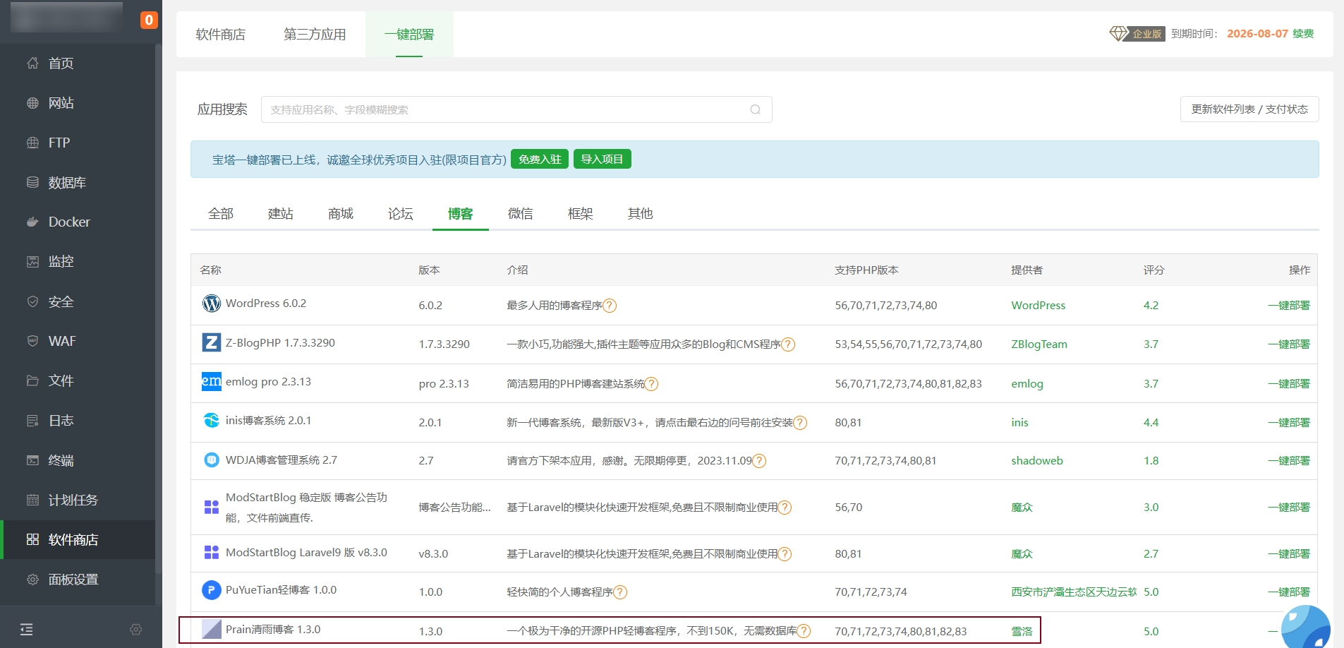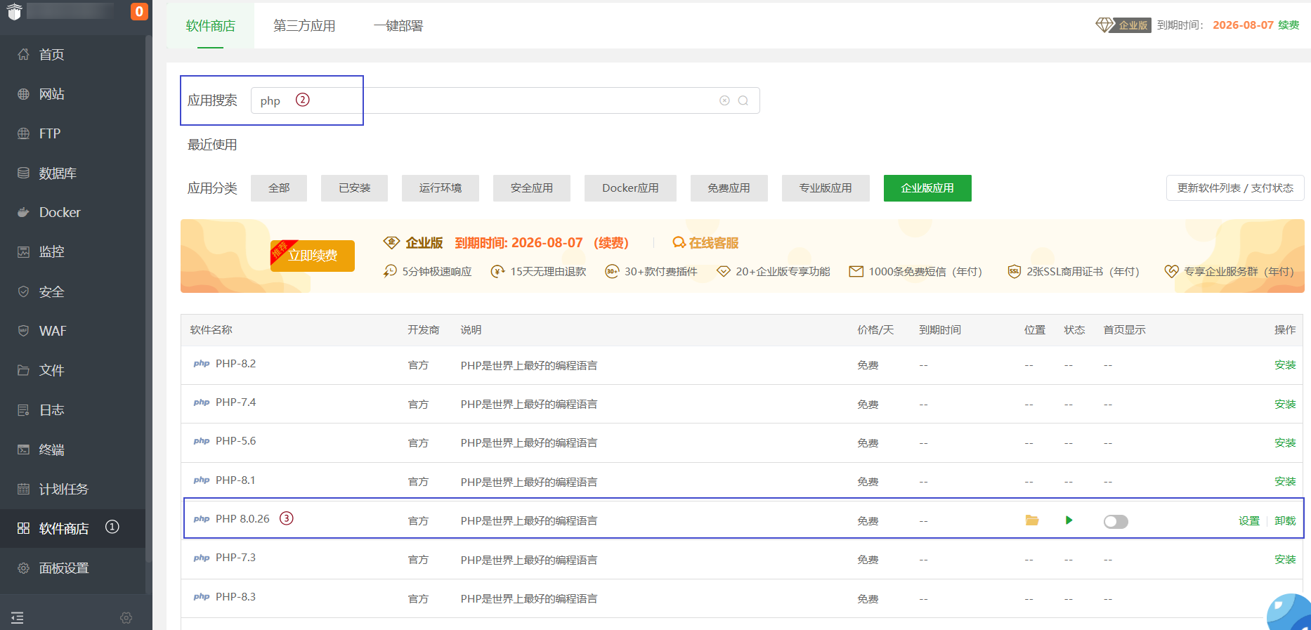 在左侧的导航栏中找到软件商店,搜索PHP并安装PHP 8.0: